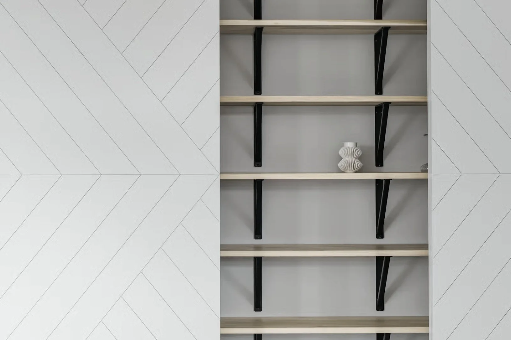 The interior design is Highlighting a decorative Grey chevron patterned storage system throughout the main space. This creates a sophisticated and multifaceted backdrop for the various events held here, while it hides all necessary preparations for multiple events.